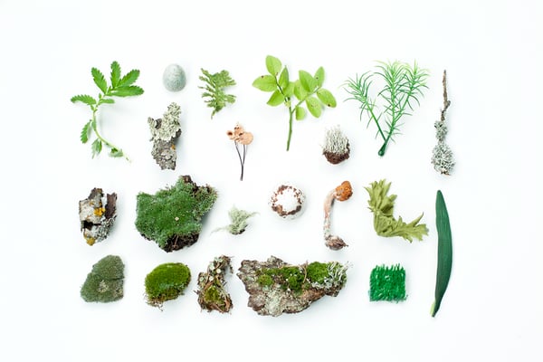 arrangiert und fotografiert natürlichen Materialien neben künstlichen vor hellem Hintergrund. Die Nachbildungen sind von den echten Teilen beinahe nicht mehr zu unterscheiden.