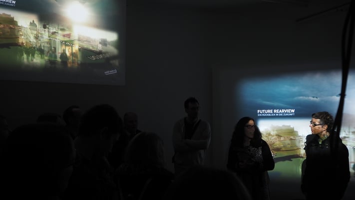 „Future Rearview – Ein Rückblick in die Zukunft“ ist eine interaktive Installation und Medienkunstwerk, das sich in einer dokumentarischen Recherche mit der Vergangenheit und Zukunftsutopien von Orten und Personen in Salzburg beschäftigt.
