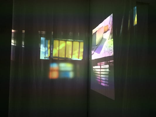farbige, aus dem Alltag entnommene Kompositionen. Ihre Grenzen verschwimmen im zerteilten Raum, sie werden zu Farbflächen in der Installation und lösen neue, sich über die Zeit verändernde Bilder