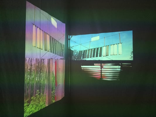 aus. Jeder Blickwinkel setzt andere Sequenzen und Bildausschnitte zusammen, das Bild wird räumlich. Im nächsten Moment verschwindet das Bild, die Farbprojektionen pausieren. Es bleibt eine