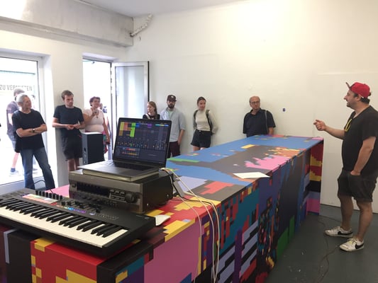 (postmodernes) Gebäude zusammensetzt. Es entsteht eine digital erzeugte ungegenständliche Malerei, die der Künster über unterschiedliche Medien im Ausstellungsraum architekturbezogen präsentiert.