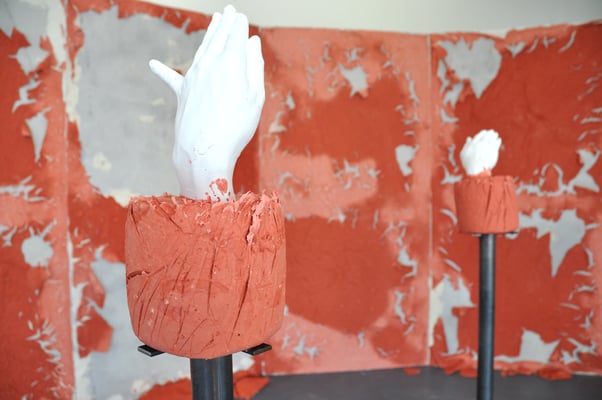 Kaja Clara Joo das Bild des mythenumworbenen Ortes eines Künstlerateliers um. Für die Ausstellung gießt sie eine im Verhältnis verkleinerte Kopie ihres Arbeitsraumes in die Räumlichkeiten