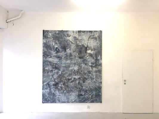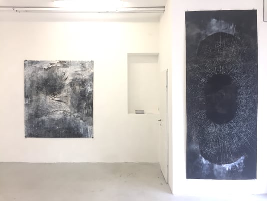 new experiences of place driven by the multifaceted virtual worlds of digital network spaces. Poetics of Bits incorporates the use of a large wall hanging X-Y axis pen plotting robot: a polargraph machine compatible with open-source software that ‚translates‘ the initial analog hand drawings. Initial drawings that sprawl over the entire working surface are digitized into generative images to be fed to the plotter. As it plots, I intervene by shifting the paper and maskingareas as it moves across the surface. I work along with the machine, continuing to draw with pen, sharpie, and graphite. Born from this symbiosis of human creativity and machine intelligence, the work reflects the tension between precision and abstraction.