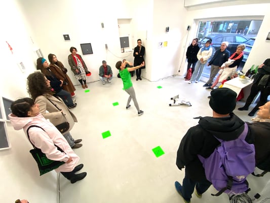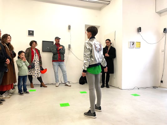 bringt in einer Live-Performance die Ausstellungselemente unmittelbar verkörpert in die Gegenwart.