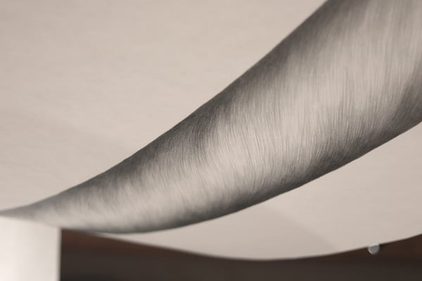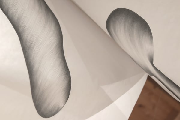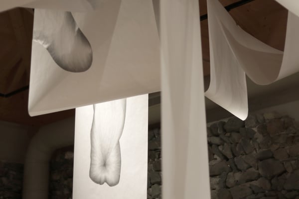 Das dafür verwendete großformatige Papier hat eine geringe Grammatur und bewegt sich mit Körpern im Raum leicht mit. Dadurch hat das Objekt etwas von einem atmenden, eigenständigen Organismus, der im Raum präsent ist. Ähnlich einem kollektiv im Gedächtnis gebliebenen Umstand, einer Erinnerung oder Überlieferung. Außerdem sind durch das dünne, leicht durchscheinende Papier Zeichnungen auf beiden Seiten zu sehen, wodurch vorne/hinten, Bühne/Zuschauer*innenraum, oben/unten, mein/dein, unser/euer, Schaustück/Betrachter*in verschwimmt, was das Ganze um eine weitere Bedeutungs- und Diskussionsebene ergänzt.