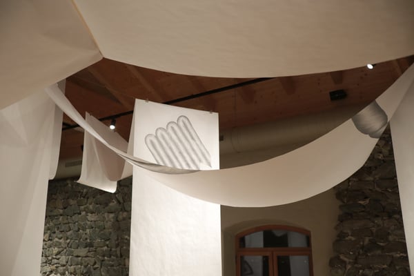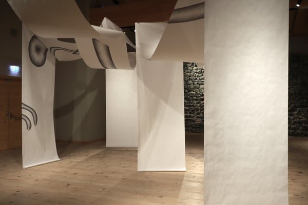 Großformatige bezeichnete Papierbahnen sind objekthaft im Museumsraum platziert. Auf ihnen sind einzelne Objekte in Zeichenlinien eingewickelt – und so ein weiteres Mal konserviert – zu sehen. Dabei gilt das Interesse unscheinbaren Objekten, denen besondere Aufmerksamkeit durch Aufgreifen, in der Größe aufgeblasen gezeichnet, gewidmet ist. Ähnlich einem Mikroskop interessiert es die Künstlerin, Größenverhältnisse zu verändern und den Museumsraum durch ihre Intervention zu einer Schnittmenge von Welten zu machen. Diese gezeichneten Formen haben formale bzw. theoretische Ansatzpunkte mit der Sammlung des Hauses, sind manchmal angeschnitten und werden jedoch weitgehend als abstrakte Instanzen rezipiert. Das weiße Papier, das dabei zum Einsatz kommt, gleicht einem neuen Blatt, sinnbildlich für eine neue Seite stehend, die Bestehendem zur Seite gestellt wird. Über den Köpfen windet sich das Papierobjekt durch den Raum, gibt hier Wege vor, nimmt anderswo Umwege, verzweigt sich, kürzt ab, steigt steil an, fällt rasant ab und ist so den Saumpfaden in der Region nachempfunden.